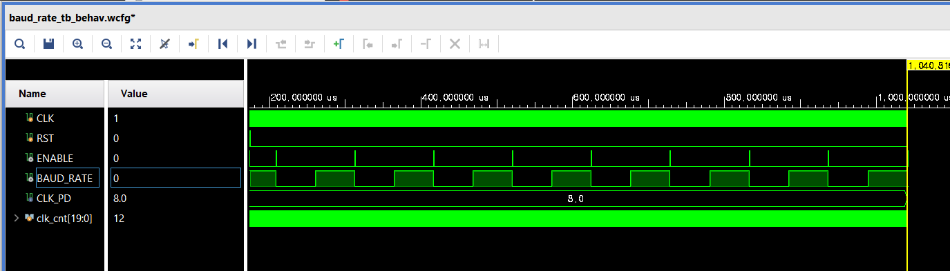 위 글을 참고하여 bit_cnt_std번의 clk마다 Baud_Rate 신호를 trigger해줌으로써 BaudRate 신호를 생성할 수 있다. enable 신호는 이 Baud Rate신호를 기준으로 생성할 수도 있다.