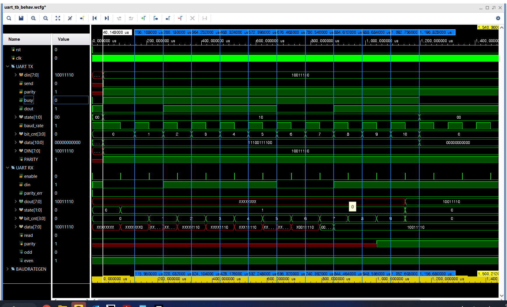 `timescale 1ns / 1ps ////////////////////////////////////////////////////////////////////////////////// // Company: // Engineer: // // Create Date: 2024/07/28 13:46:57 // Design Name: // Module Name: uart_rx // Project Name: // Target Devices: // Tool Versions: // Description: // // Dependencies: // // Revision: // Revision 0.01 - File Created // Additional Comments: // ////////////////////////////////////////////////////////////////////////////////// module uart_rx( input rst, input clk, input enable, input din, output reg parity_err, output reg [7:0] dout ); localparam odd = 1'b0, even = 1'b1; localparam [1:0] idle = 2'b00, load = 2'b01, parity_chk = 2'b10, transmit = 2'b11; reg [1:0] state = 2'b0; //idle - load - parity check - transmit reg [3:0] bit_cnt = 4'b0; reg [7:0] data; reg read = 1'b0; reg parity; always @(posedge clk) begin if(state==load) begin if(enable) bit_cnt = bit_cnt+1; end end always @(posedge clk) begin case(state) //state idle idle: begin parity_err = 0; if(enable && !din) state = load; else state = idle; end //state load load: begin if(bit_cnt<8) data[bit_cnt] = din; else begin parity = din; if((bit_cnt > 9) && (din == 1)) state = parity_chk; end end //state parity check parity_chk: begin parity_err = (^data) == parity; state = transmit; end transmit: begin dout = data; state = idle; end endcase end endmodule