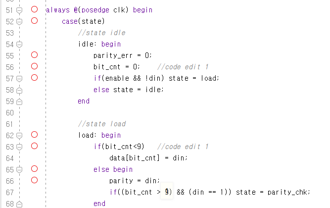 위 코드에서 주석에 code edit 1로 표기한 부분을 수정하여 문제를 해결했다, - parity error이 나타나는 부분을 확인해보니 다음과 같이 나타났다.