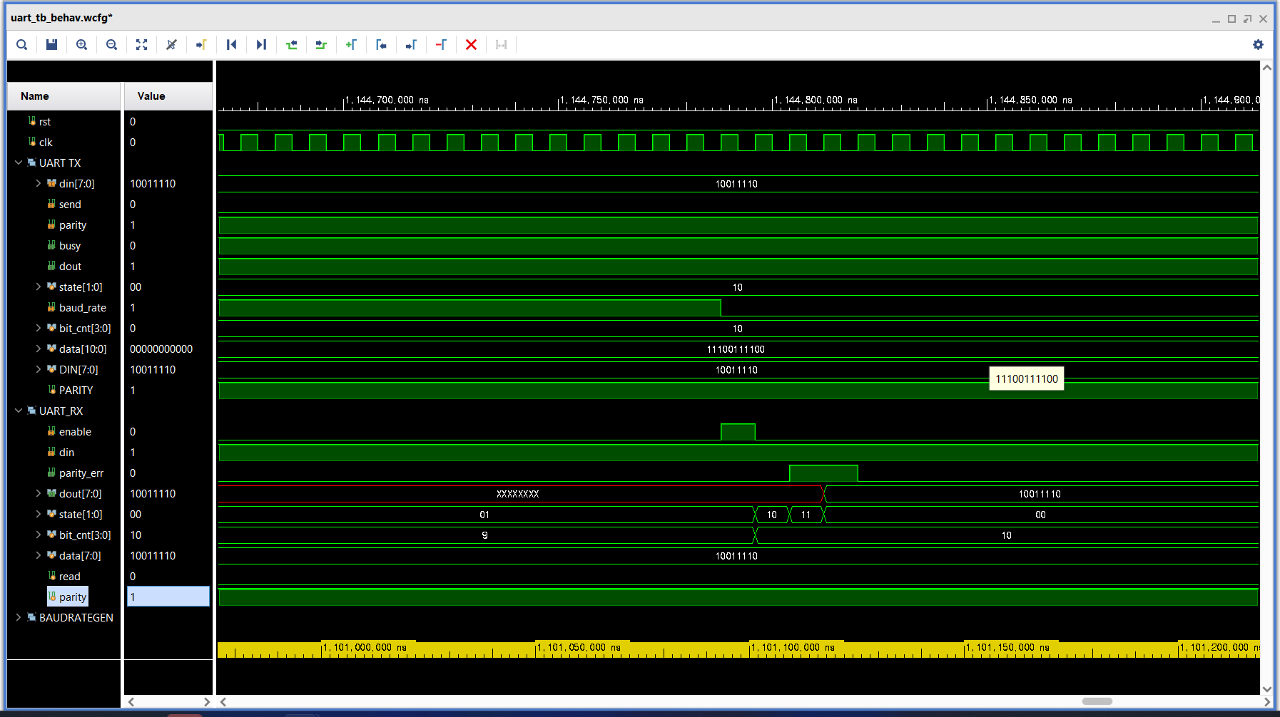 parity check 과정에서 오류가 발생했다. parity error을 출력하는 조건에 문제가 있는 것으로 보인다. - parity error 신호는 데이터의 1의 개수가 홀수일 때 parity가 odd parity이면 오류가 없다는 0을 표시해야 하는데, 코드에서 위 두 값이 같으면(오류가 없으면) 1을 표시하도록 잘못 설계하여 해당 부분을 xor 연산으로 수정하였다.